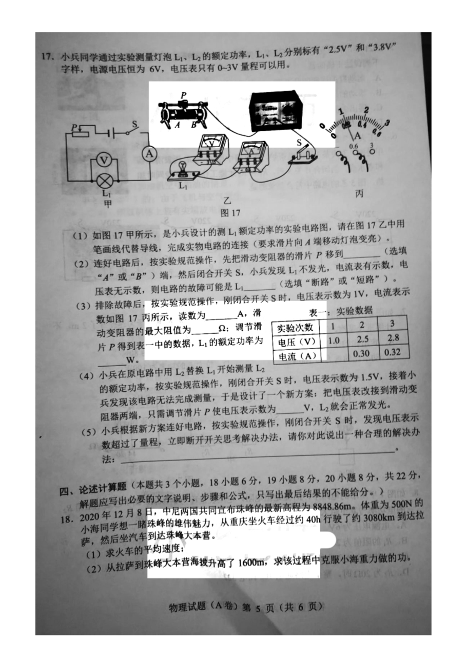 【文档名称】 2021重庆涪陵中考物理试题及答案(A卷)(图片版).doc