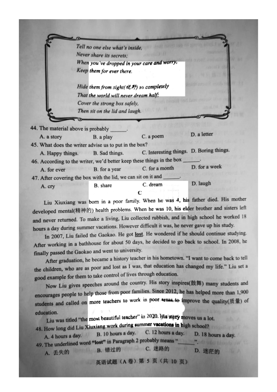 【文档名称】 2021重庆合川中考英语试题及答案(A卷)(图片版).doc
