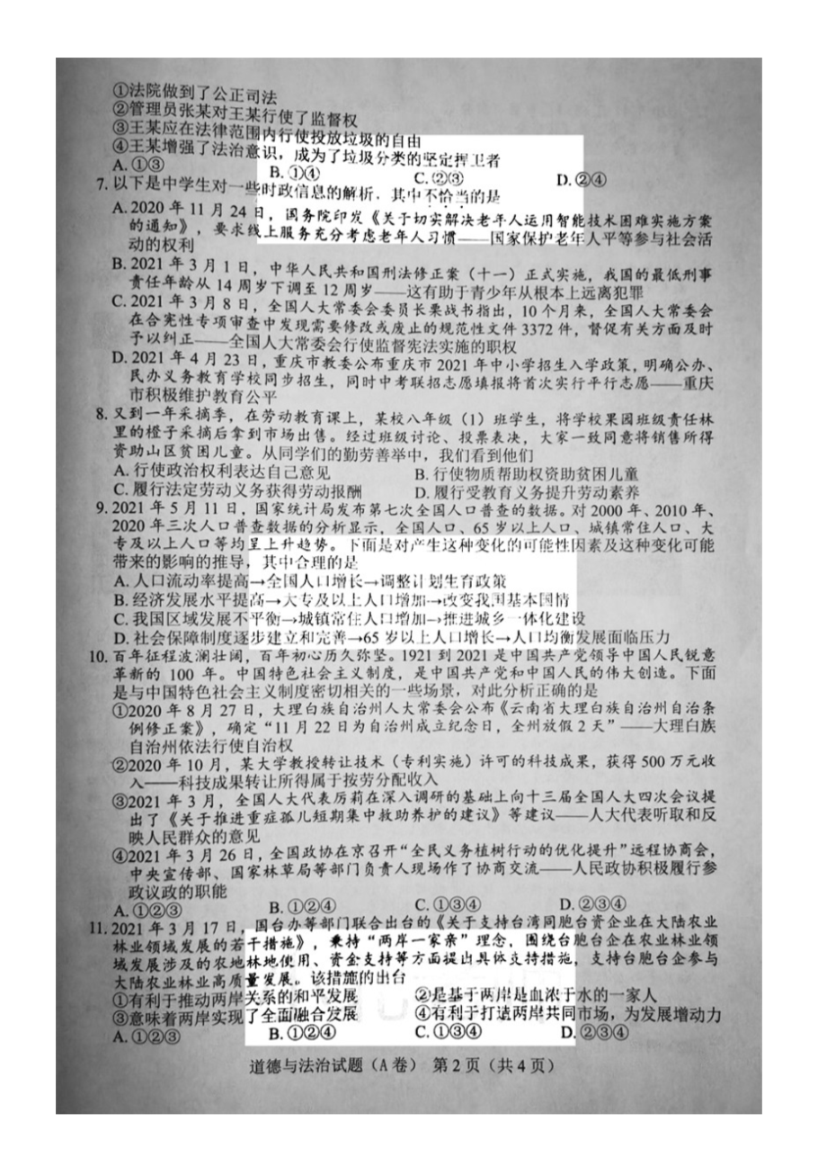 【文档名称】 2021重庆江津中考道德与法治试题及答案(A卷)(图片版).doc