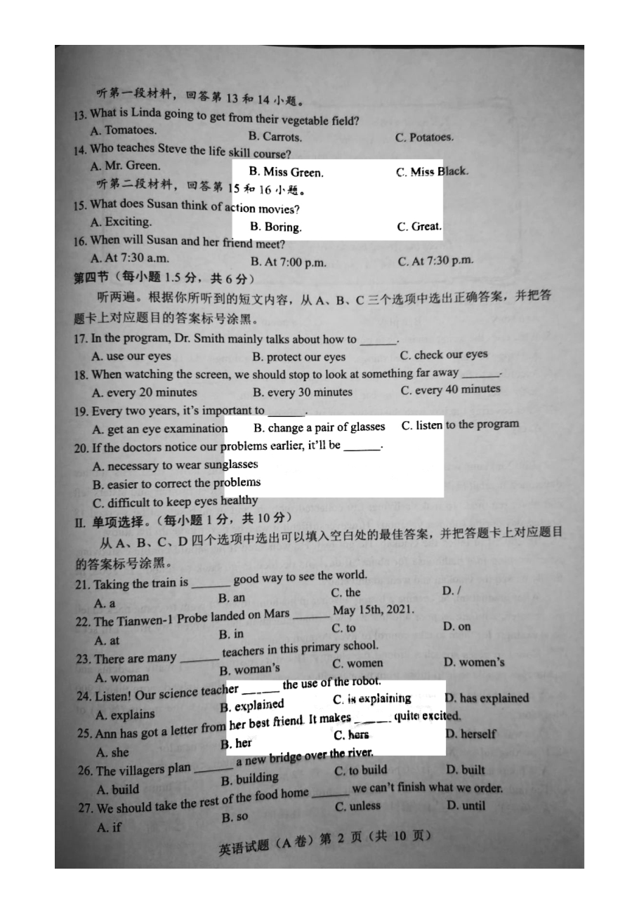 【文档名称】 2021重庆中考英语试题及答案(A卷)(图片版).doc