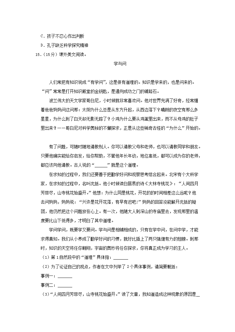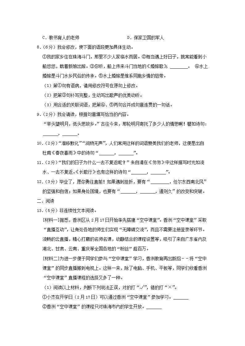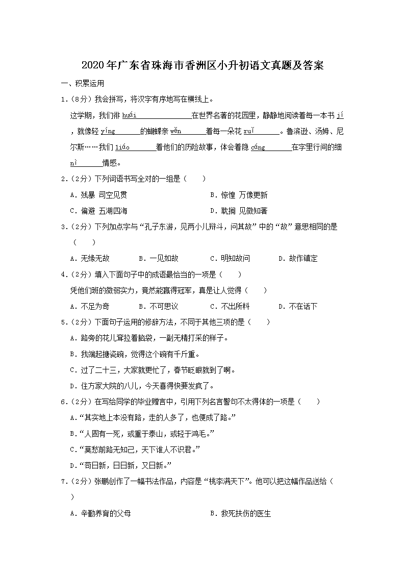 【文档名称】 2020年广东省珠海市香洲区小升初语文真题及答案(Word版).doc