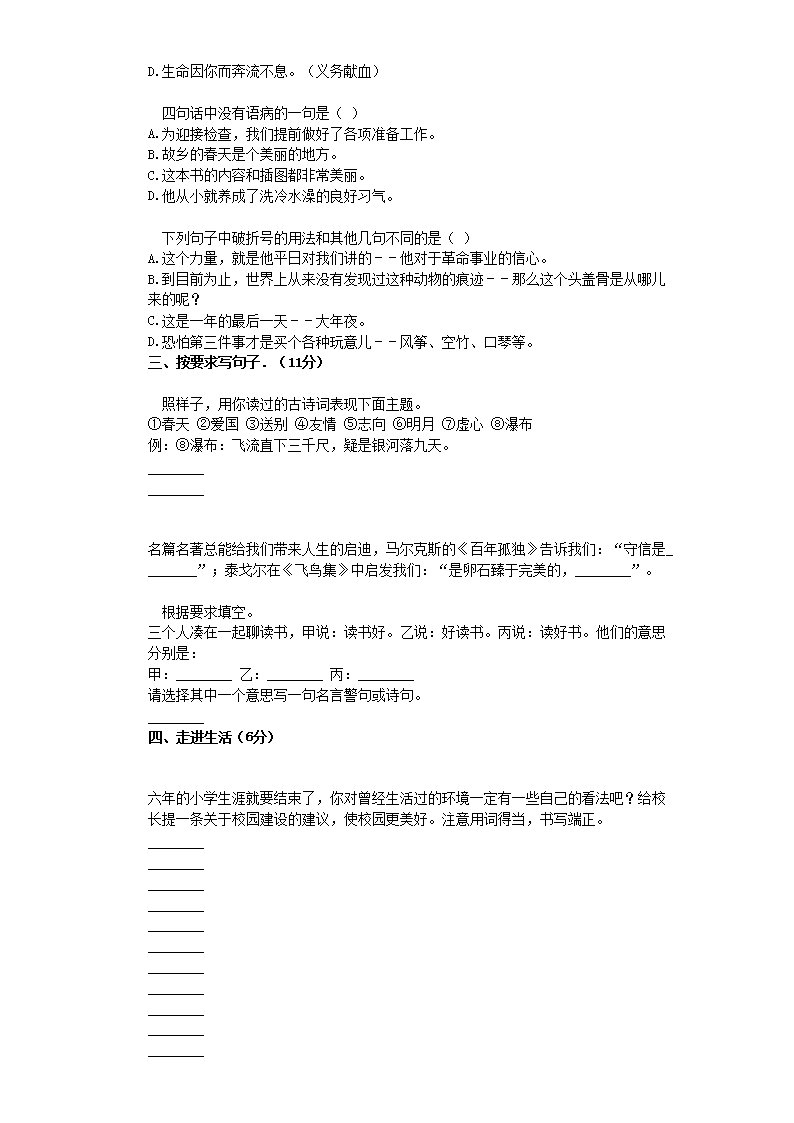 【文档名称】 2019年甘肃武威市古浪县小升初语文真题及答案(Word版).doc