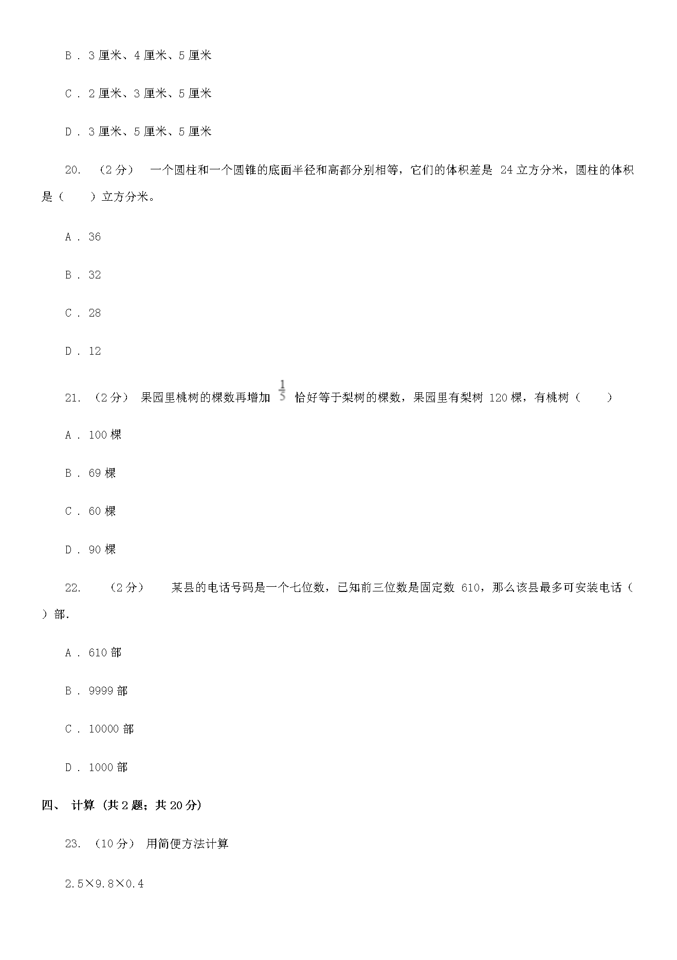 【文档名称】 2020年陕西汉中小升初数学I卷真题及答案(Word版).doc