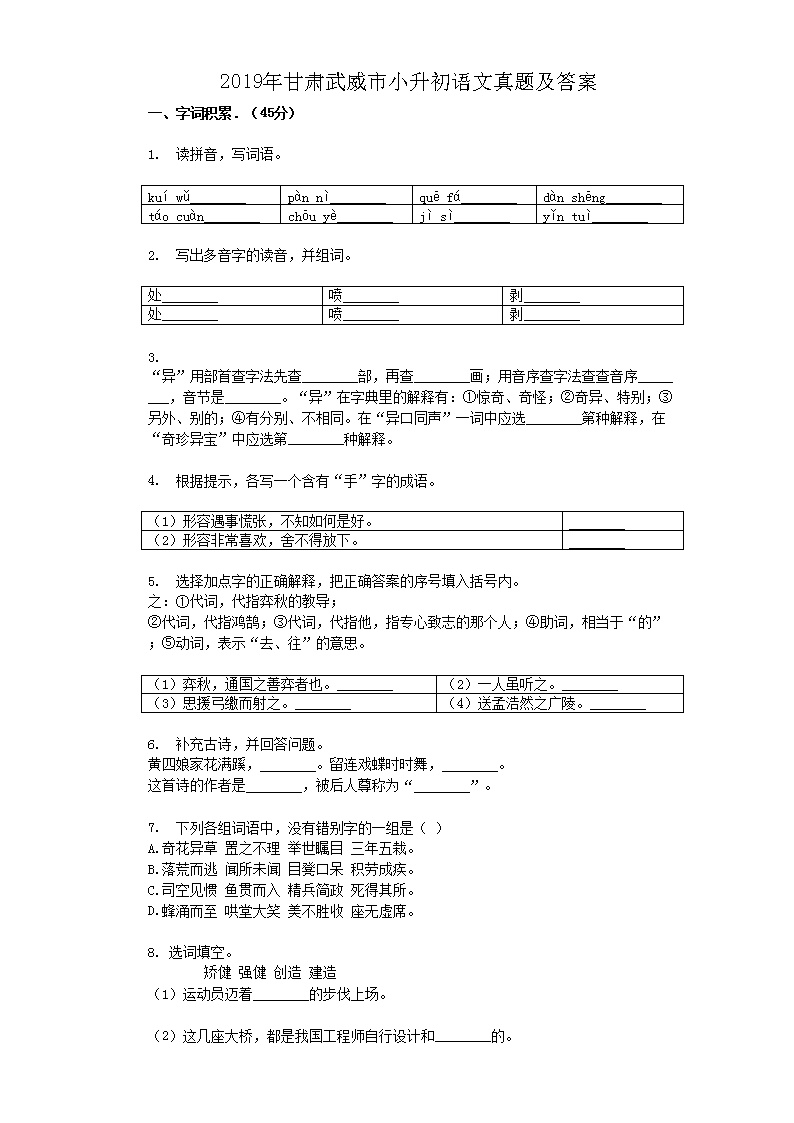 【文档名称】 2019年甘肃武威市小升初语文真题及答案(Word版).doc