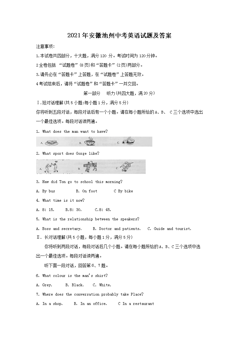 【文档预览】 无忧考网整理发布2021年安徽池州中考英语试题及答案(Word版),前五页预览如下: