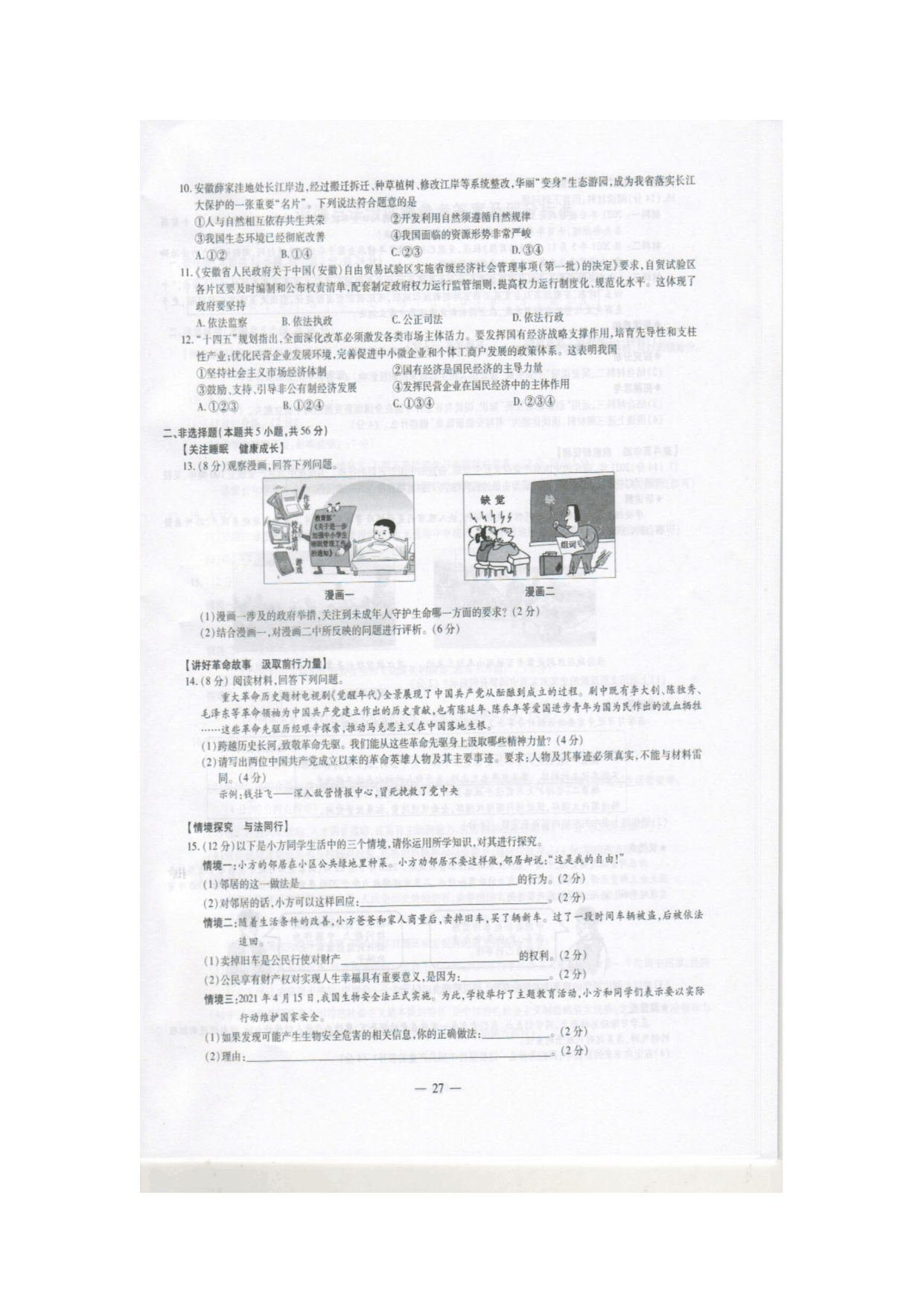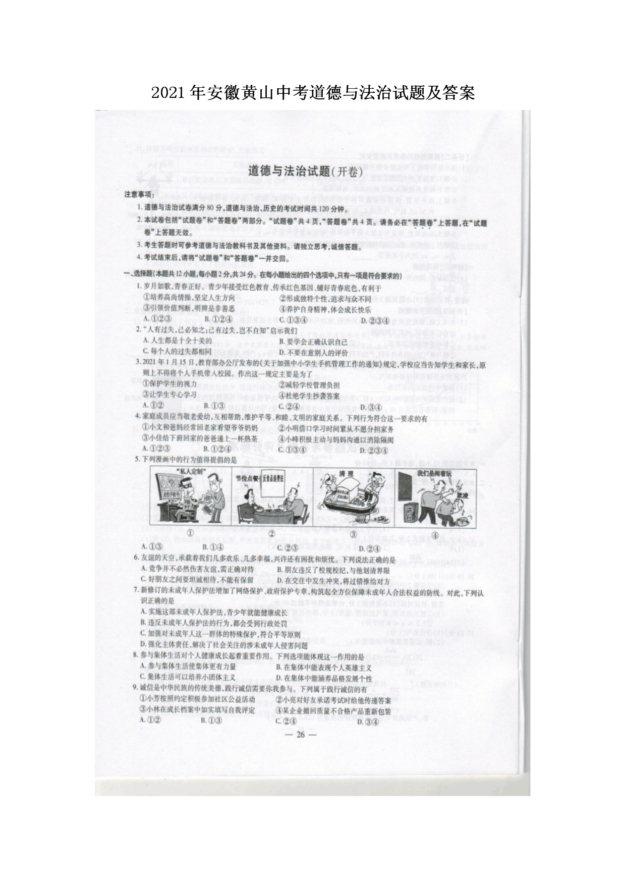【文档名称】 2021年安徽黄山中考道德与法治试题及答案(图片版).doc