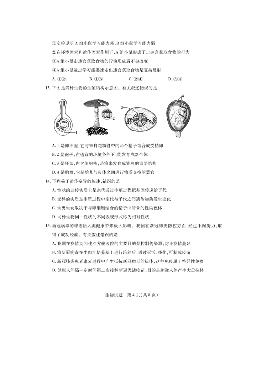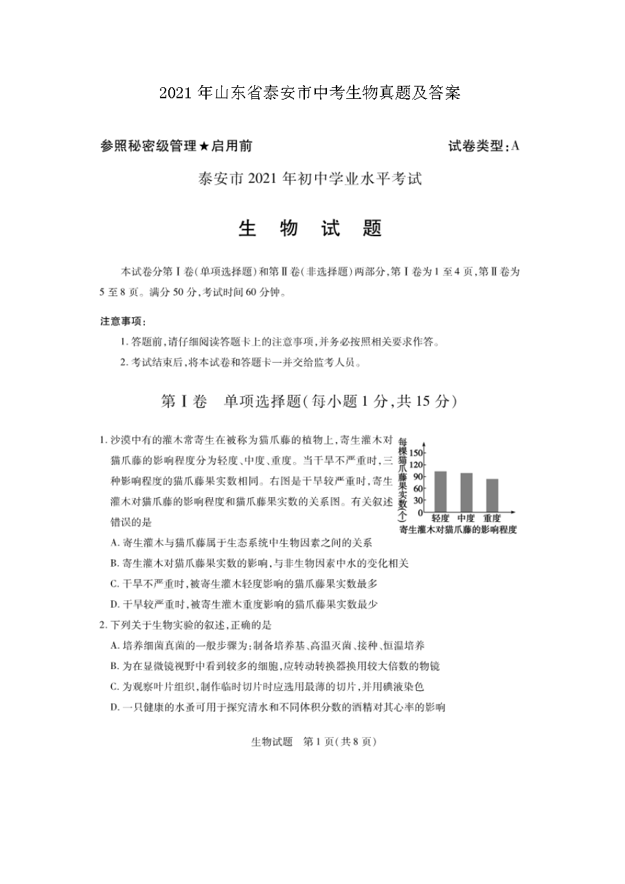 【文档预览】 无忧考网整理发布2021年山东省泰安市中考生物真题及答案(图片版),前五页预览如下: