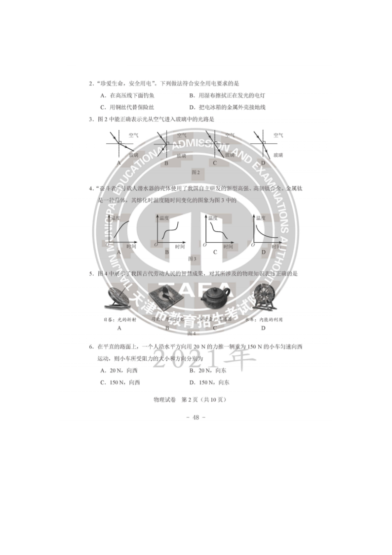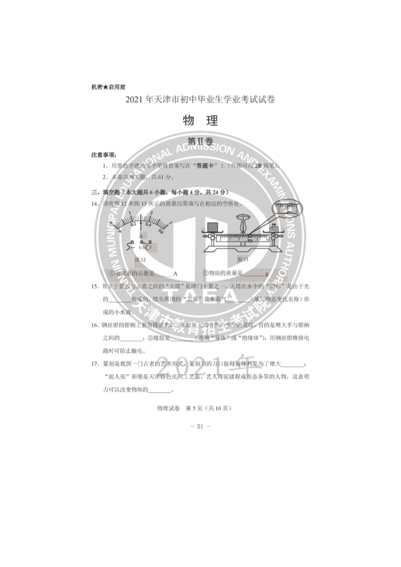【文档名称】 2021年天津市中考物理试题及答案(图片版).doc