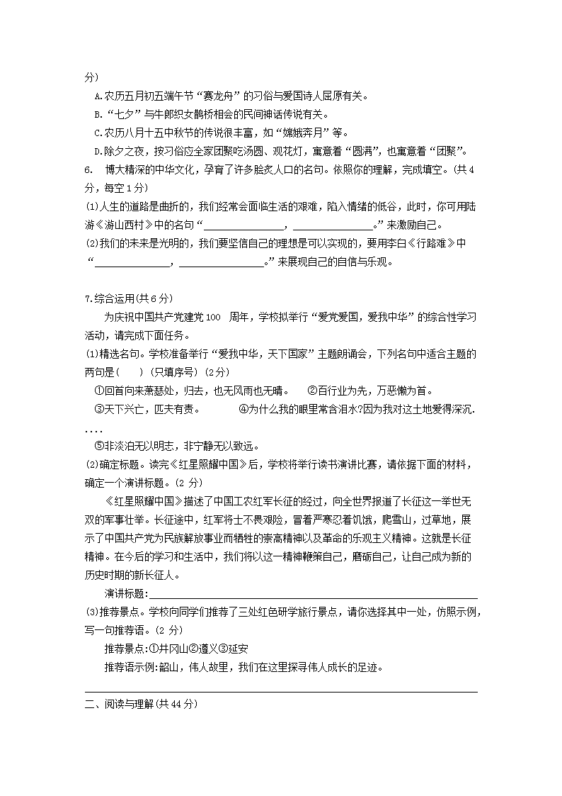【文档名称】 2021年湖南长沙中考语文真题(Word版).doc