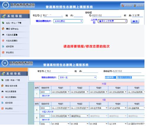 7、志愿提交后,如考生要修改某批次志愿,点击“系统导航”栏中的“填报/修改志愿”选项,选择批次后,使用“志愿提交密码”修改志愿。