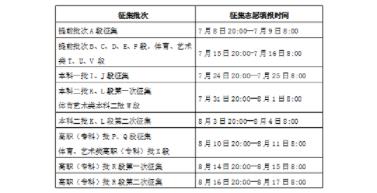 批次:本科提前批(A段、B段、C段、D段、E段、F段、G段);本科一批(H段、I段、J段);本科二批(K段、L段);高职(专科)批(P段、Q段);体育、艺术类本科一批(T段、U段、V段);体育、艺术类本科二批(W段)。