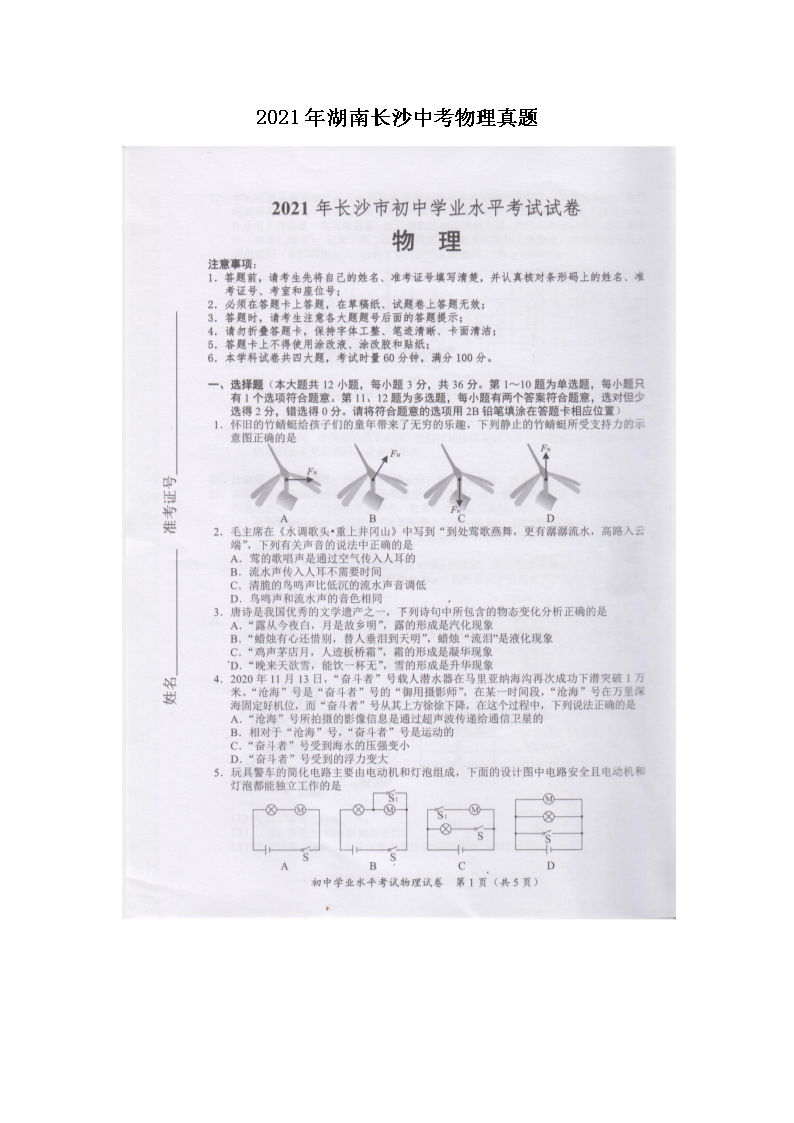 【文档名称】 2021年湖南长沙中考物理真题(图片版).doc