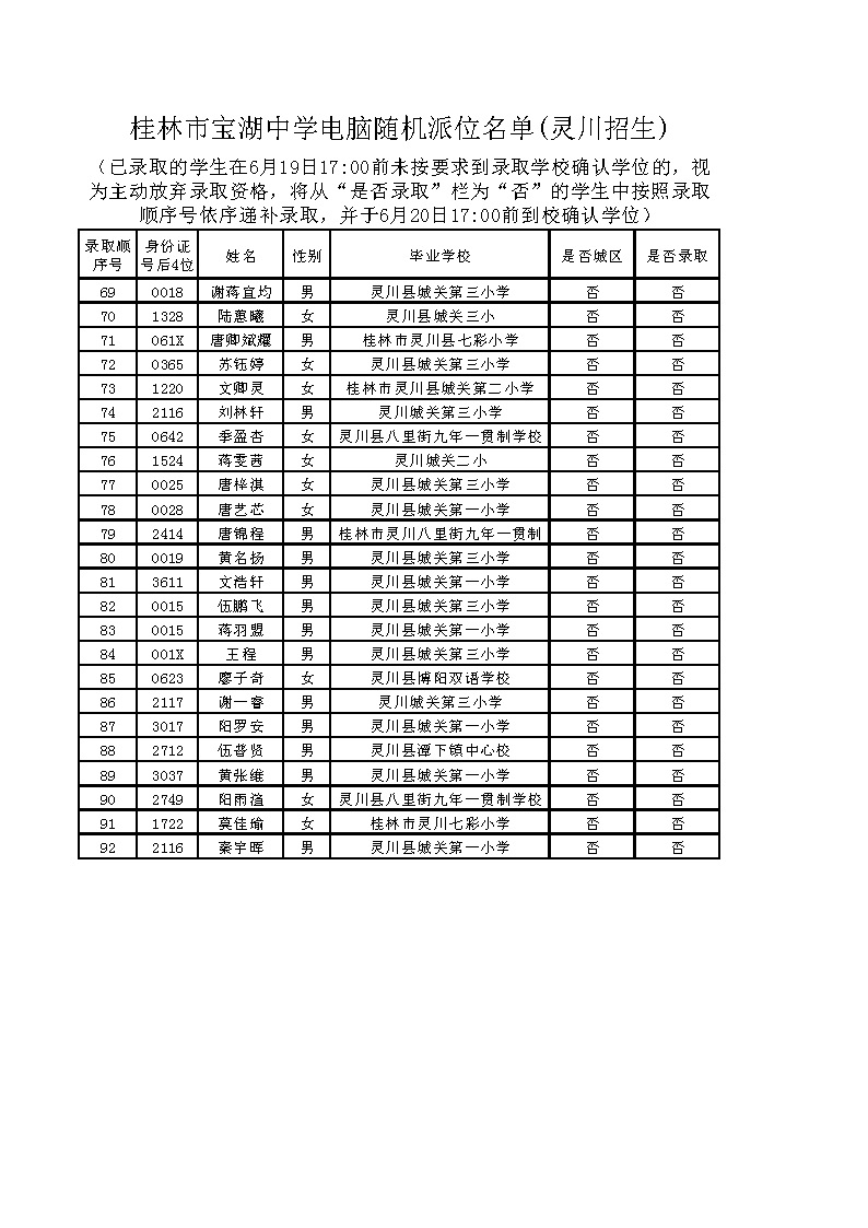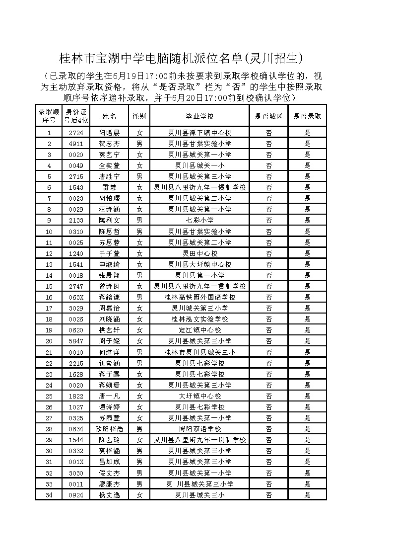 2021年广西桂林市区小升初宝湖中学电脑随机派位名单(灵川招生)