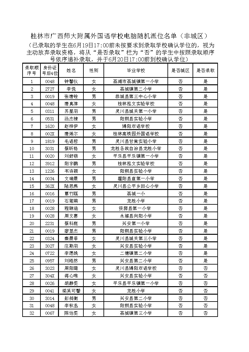 考网从桂林市教育局了解到,2021年广西桂林市区小升初师大附属外国语学校电脑随机派位名单(非城区)已发布,现将有关事宜通知如下: