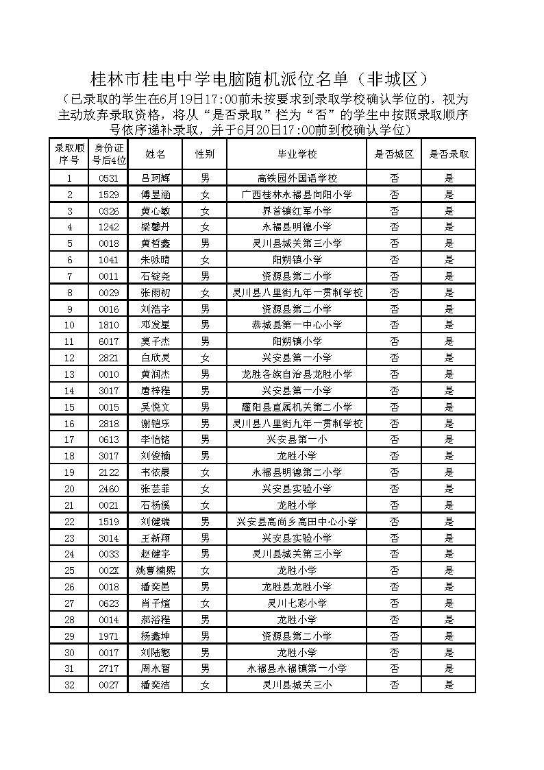 网从桂林市教育局了解到,2021年广西桂林市区小升初桂电中学电脑随机派位名单(非城区)已发布,现将有关事宜通知如下:
