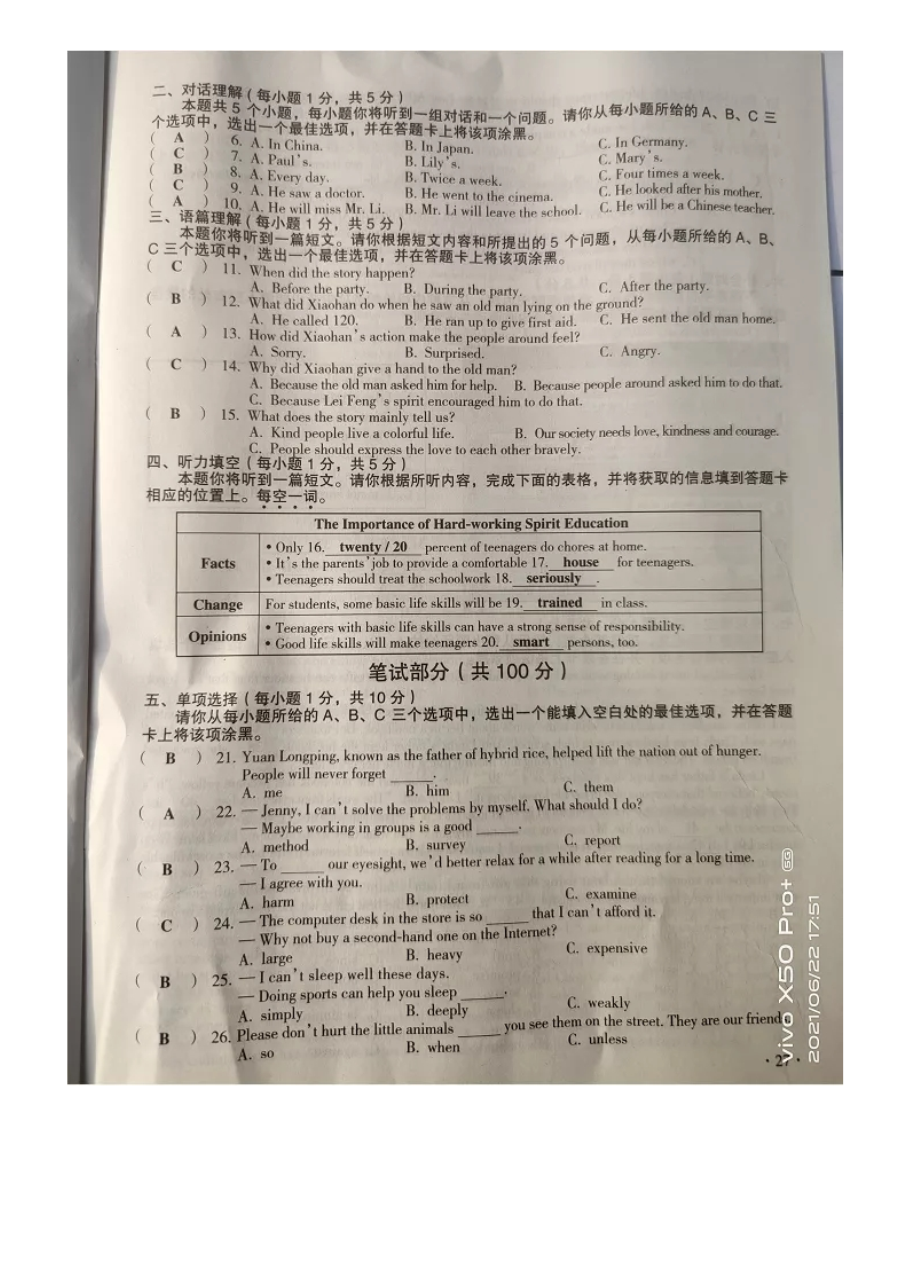 【文档预览】 无忧考网整理发布2021年山西朔州中考英语试题及答案(图片版),前五页预览如下: