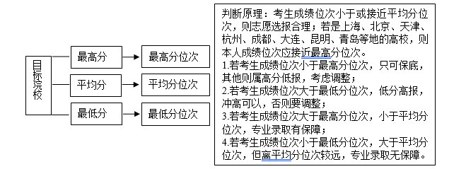 4.使用位次法精准测算。位次法是用考生本人的高考成绩位次比较目标院校上年或近三年录取的最低分位次平均分位次、分位次测算目标院校的一种方法,具体的运用原理如下图: