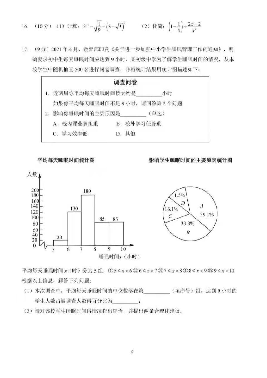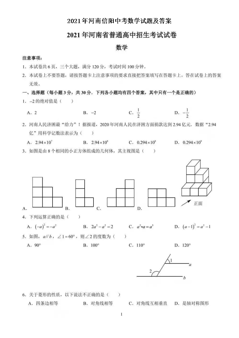【文档名称】 2021年河南信阳中考数学试题及答案(图片版).doc