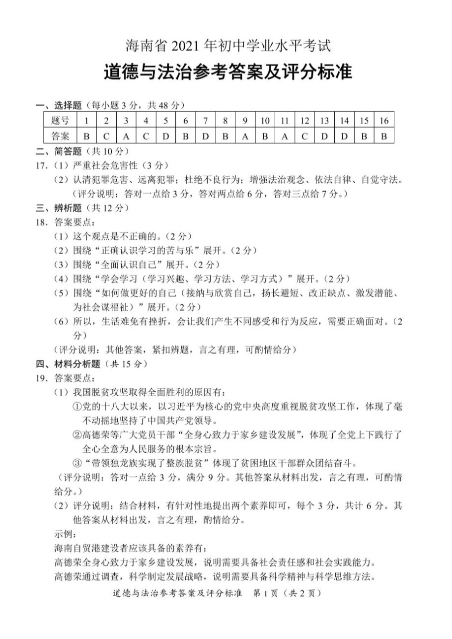 【文档预览】 无忧考网整理发布2021年海南海口中考政治试题及答案(图片版),前五页预览如下: