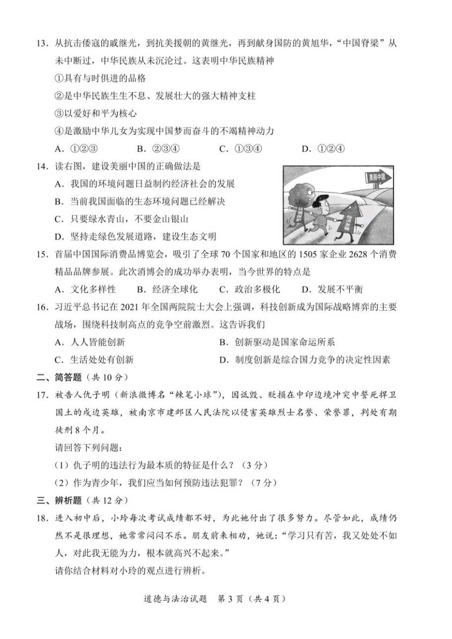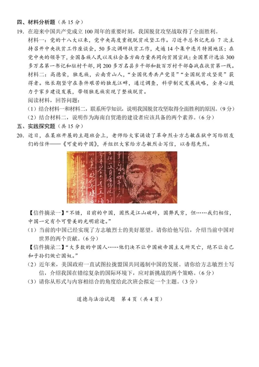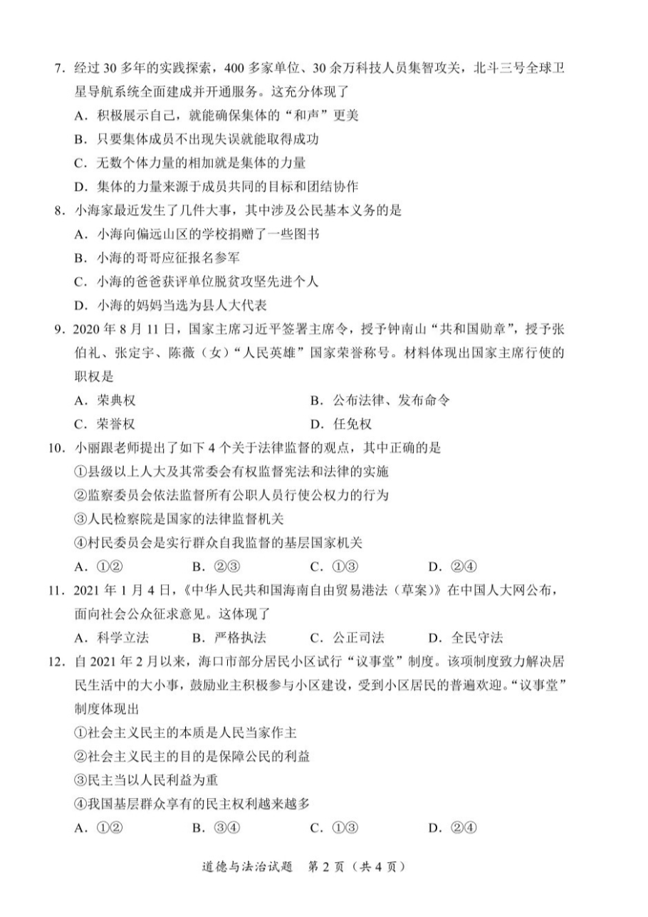 【文档名称】 2021年海南海口中考政治试题及答案(图片版).doc
