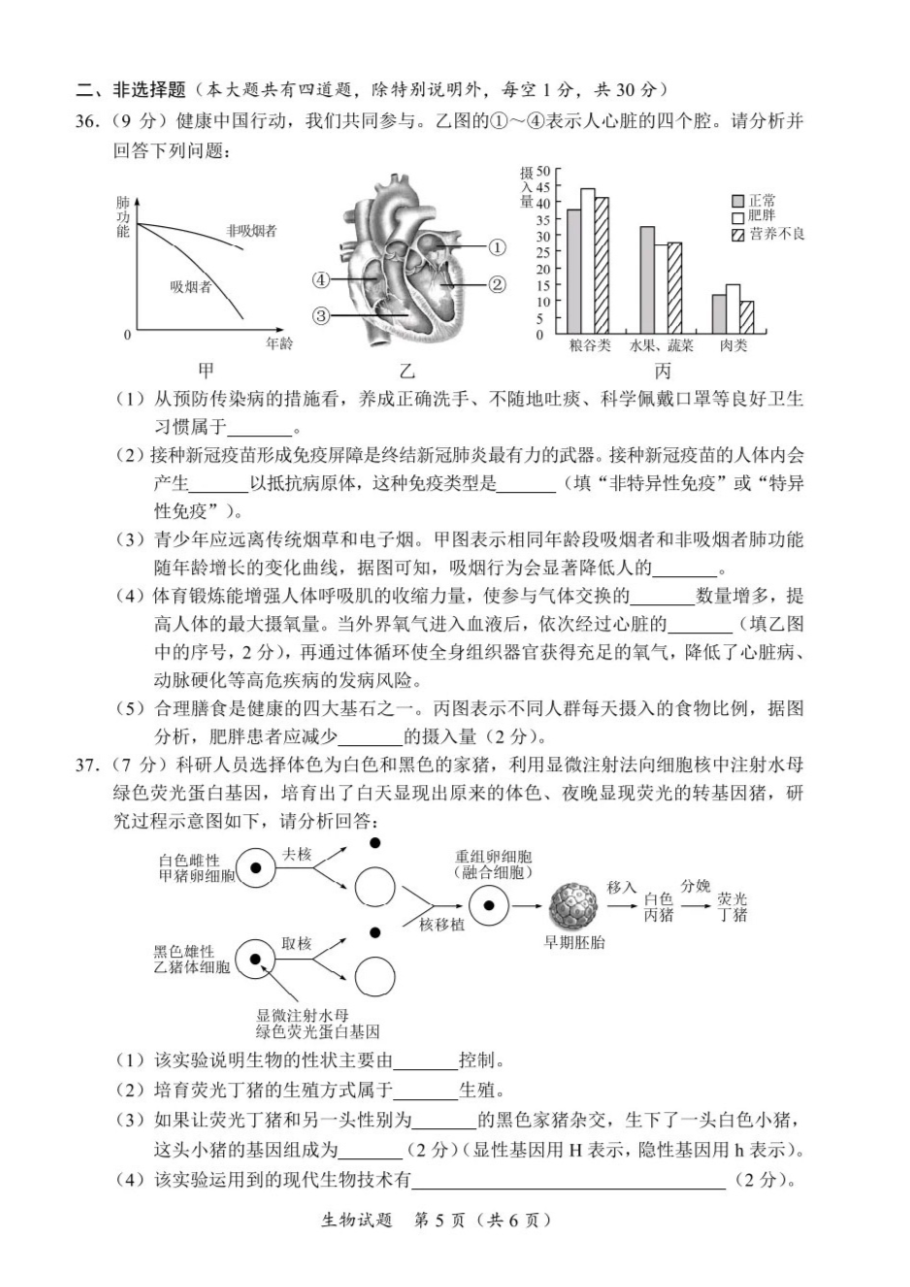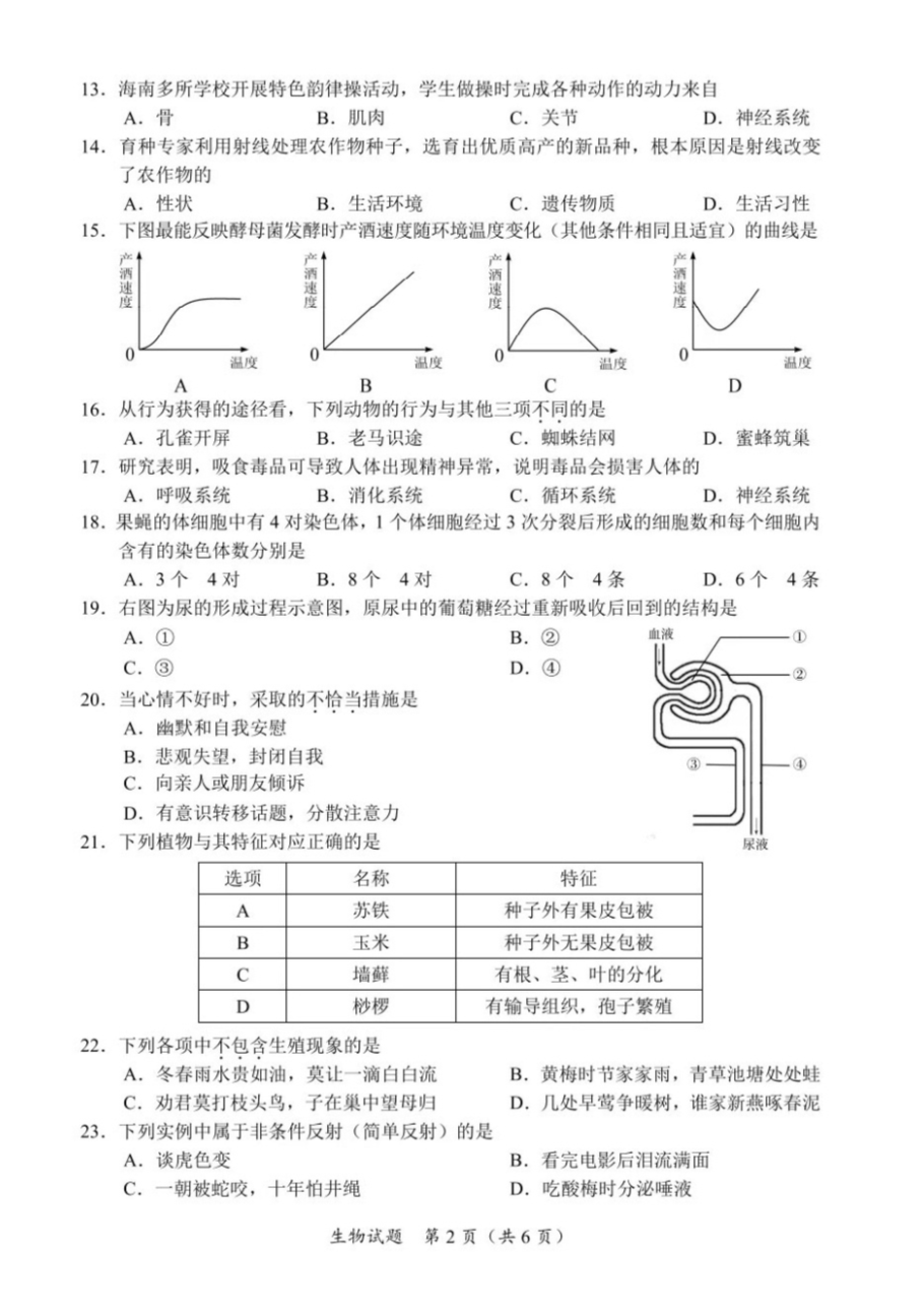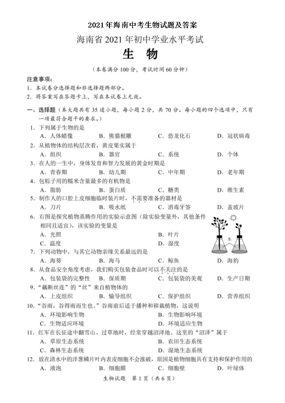 【文档名称】 2021年海南中考生物试题及答案(图片版).doc