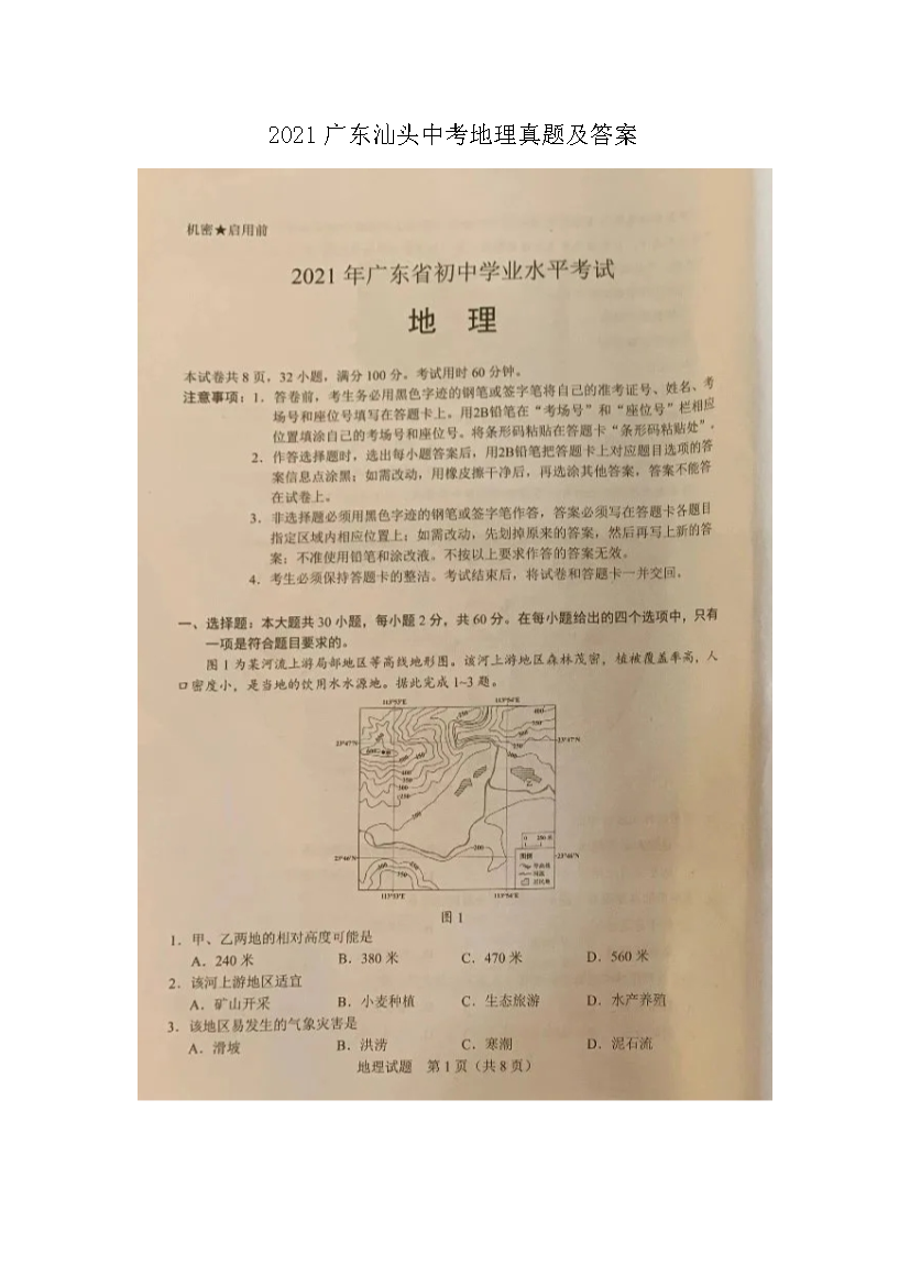 【文档预览】 无忧考网整理发布2021广东汕头中考地理真题及答案(图片版),前五页预览如下: