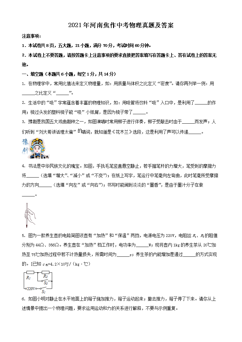 【文档名称】 2021年河南焦作中考物理真题及答案(Word版).doc