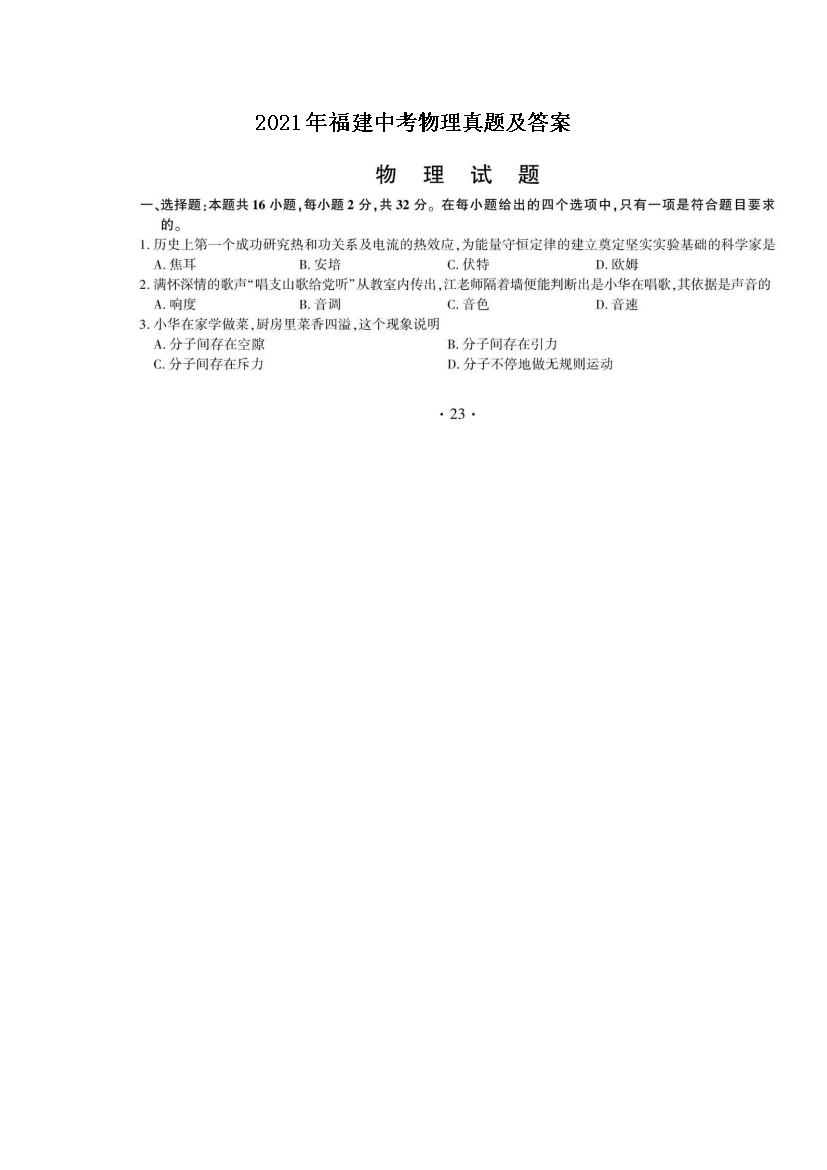【文档名称】 2021年福建中考物理真题及答案(图片版).doc