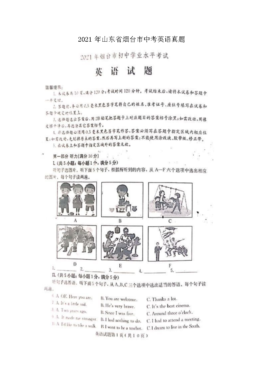 【文档名称】 2021年山东省烟台市中考英语真题(图片版).doc