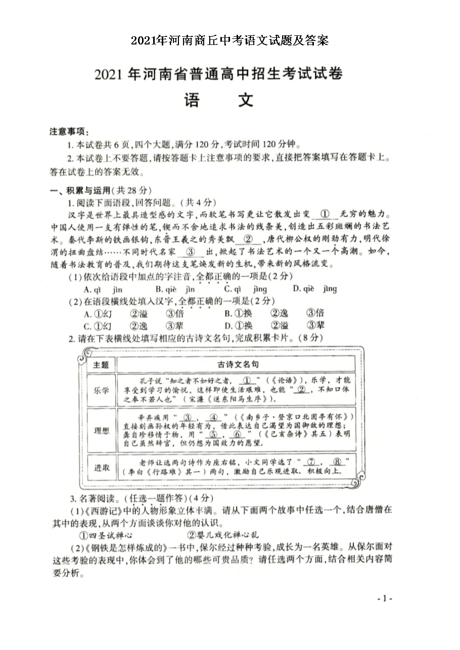 【文档名称】 2021年河南商丘中考语文试题及答案(图片版).doc