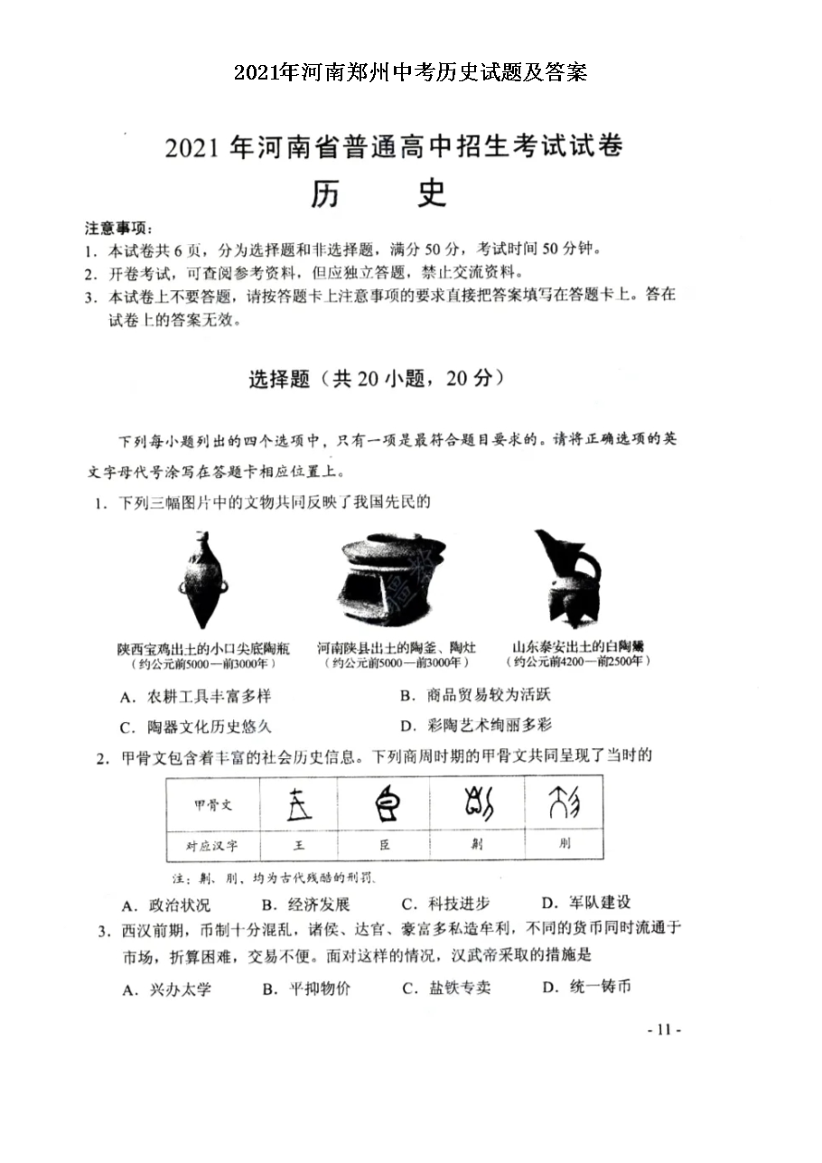 【文档名称】 2021年河南郑州中考历史试题及答案(图片版).doc