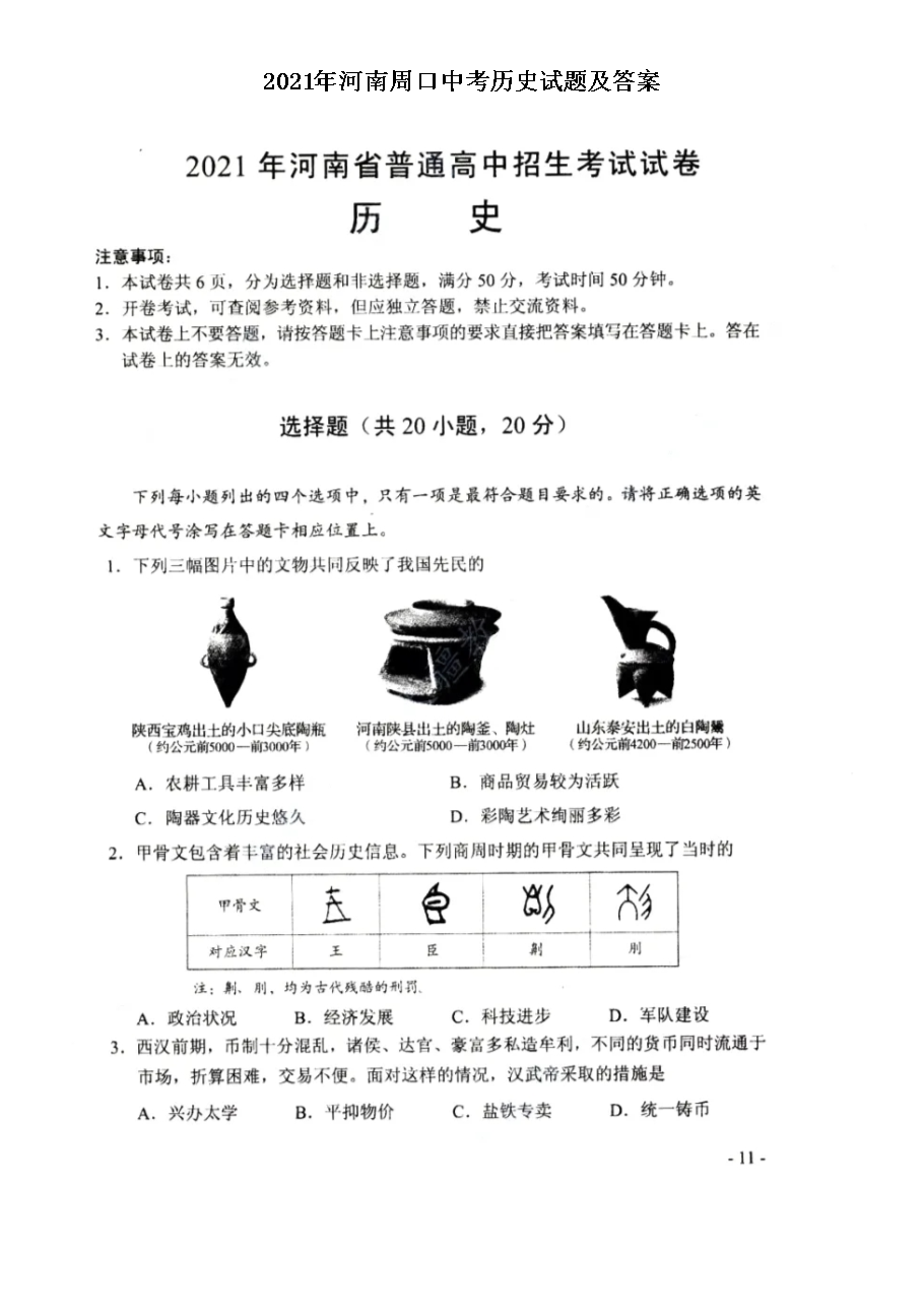 【文档名称】 2021年河南周口中考历史试题及答案(图片版).doc
