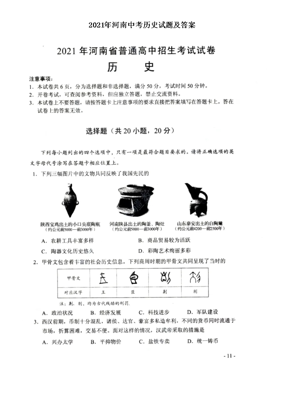 【文档名称】 2021年河南中考历史试题及答案(图片版).doc