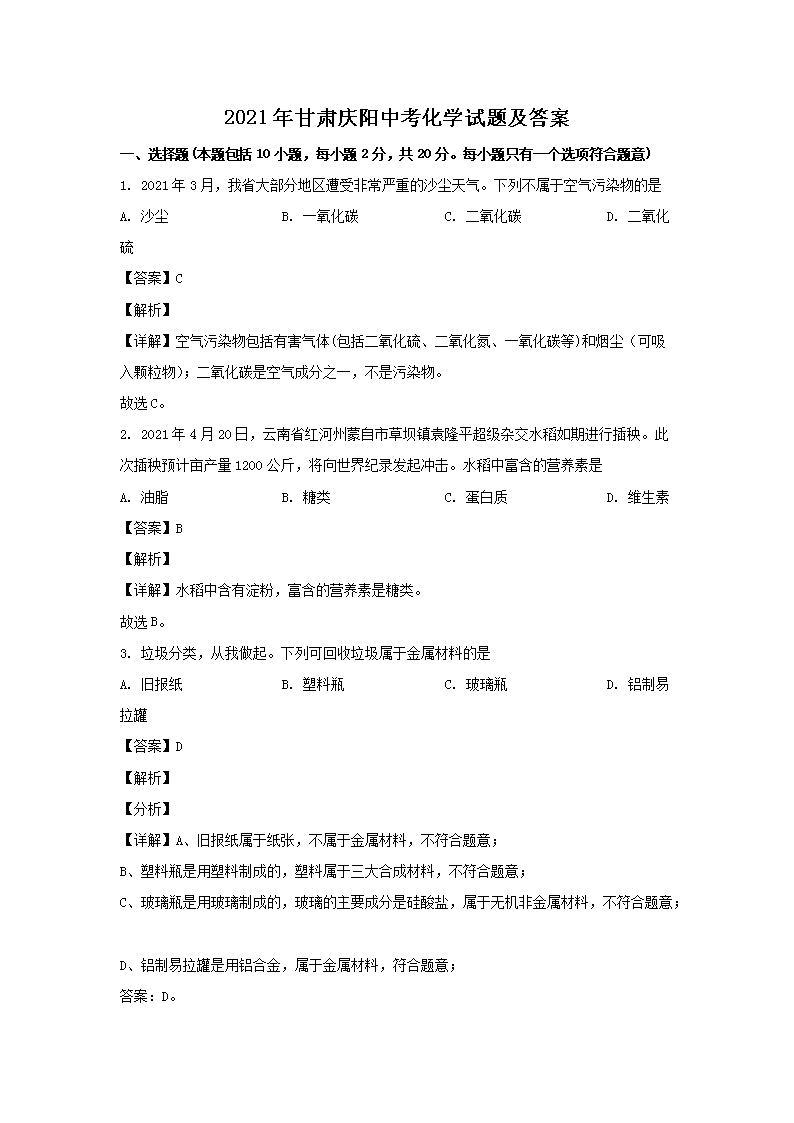 【文档名称】 2021年甘肃庆阳中考化学试题及答案(Word版).doc