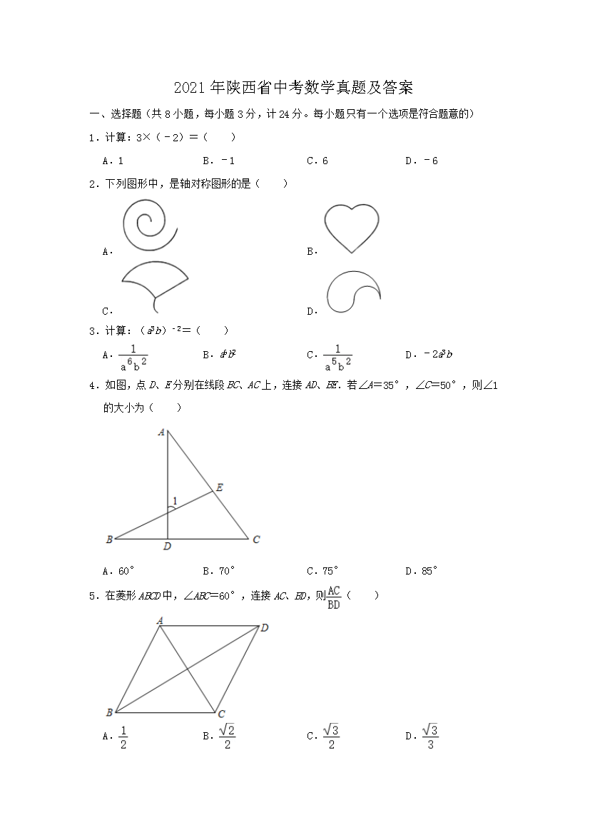 【文档名称】 2021年陕西省中考数学真题及答案(Word版).doc