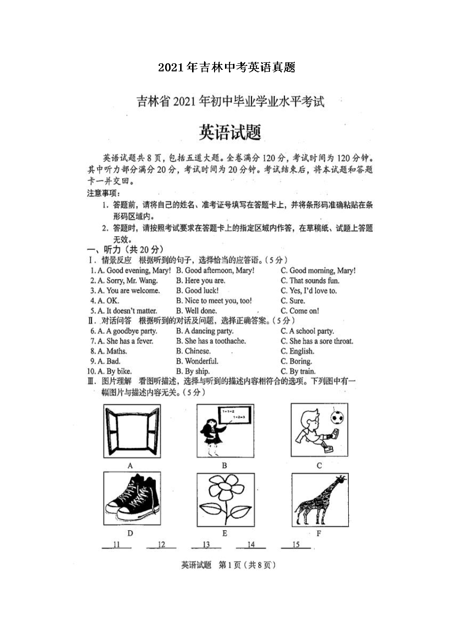【文档名称】 2021年吉林中考英语真题(图片版).doc