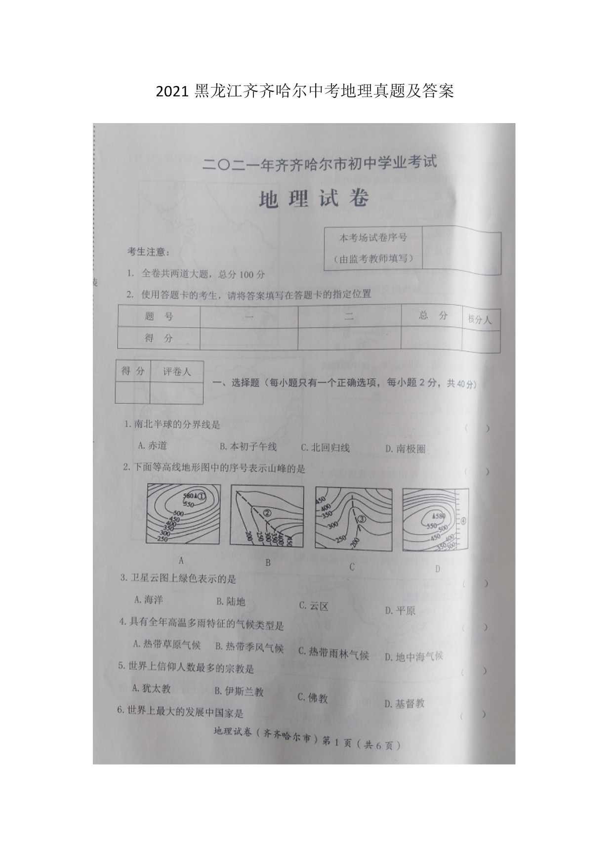 【文档预览】 无忧考网整理发布2021黑龙江齐齐哈尔中考地理真题及答案(图片版),前五页预览如下: