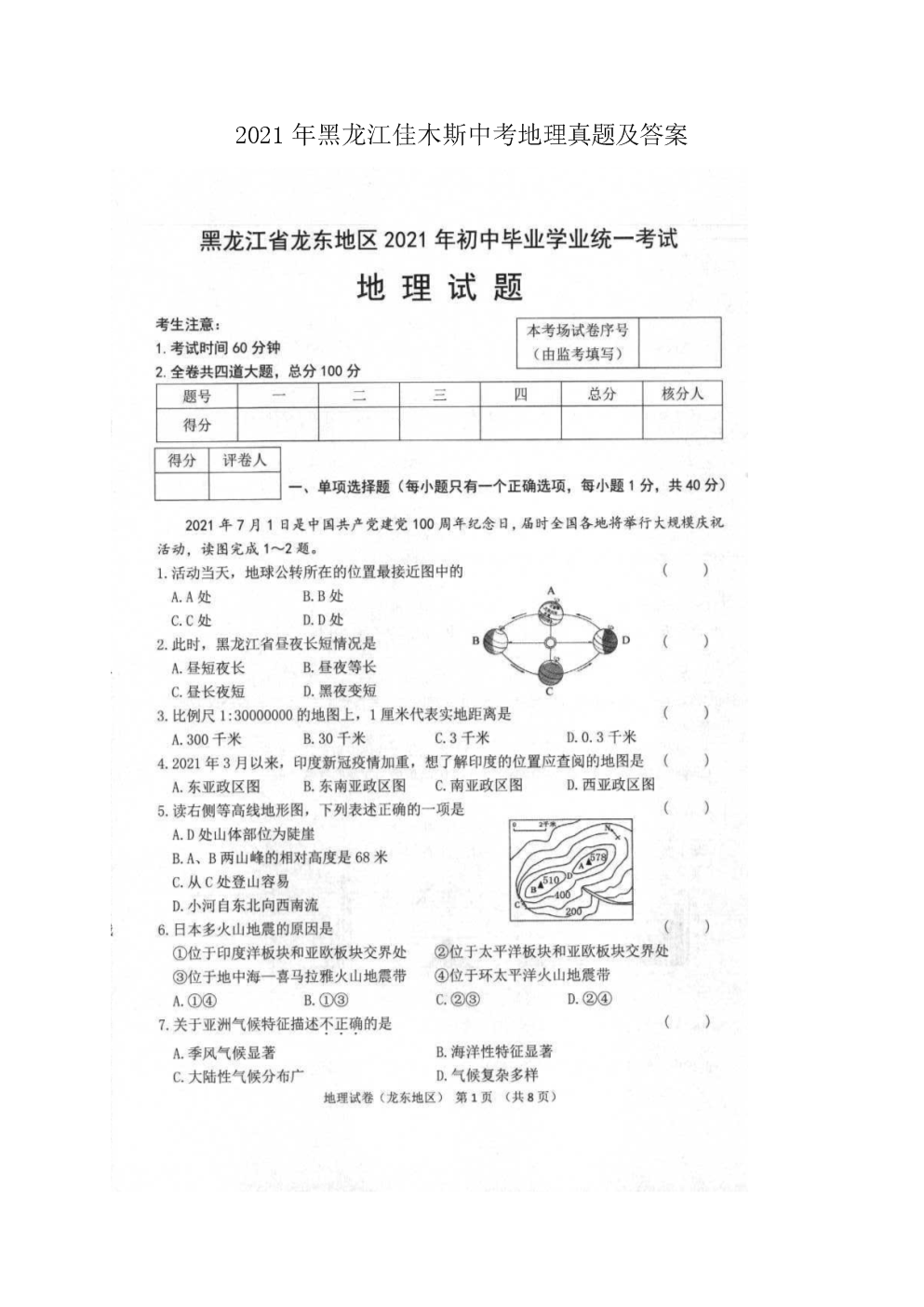 【文档预览】 无忧考网整理发布2021年黑龙江佳木斯中考地理真题及答案(图片版),前五页预览如下: