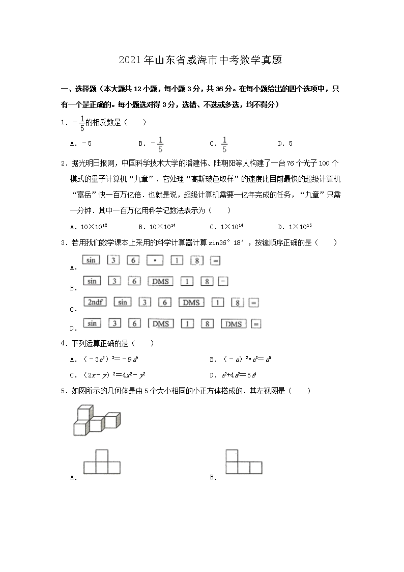 【文档预览】 无忧考网整理发布2021年山东省威海市中考数学真题(Word版),前五页预览如下: