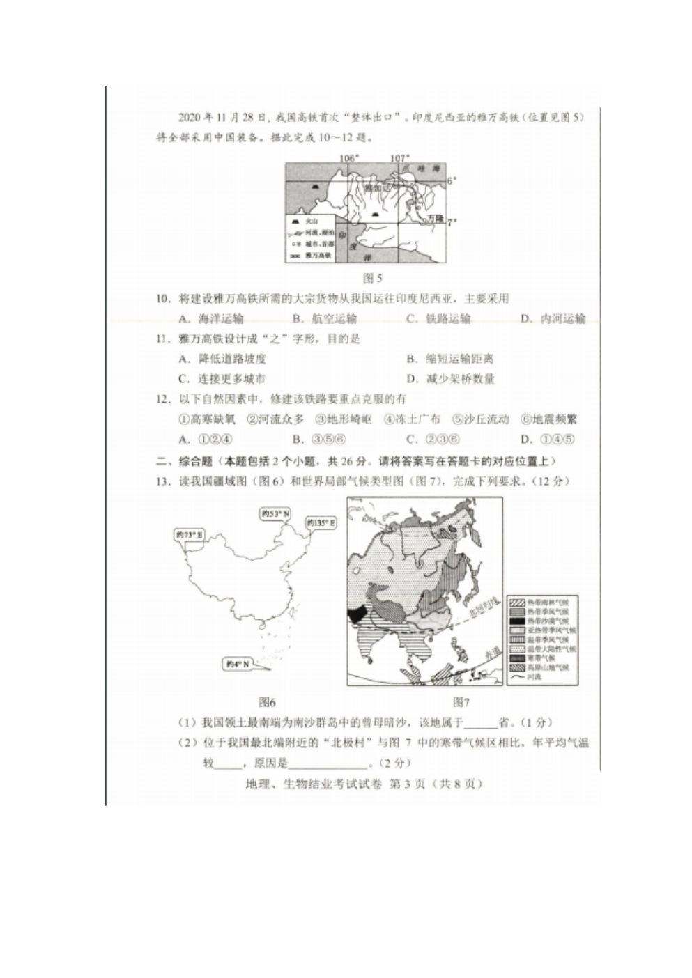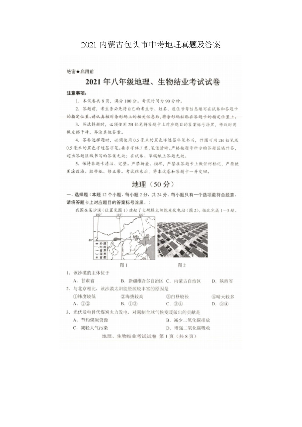 【文档名称】 2021内蒙古包头市中考地理真题及答案(图片版).doc