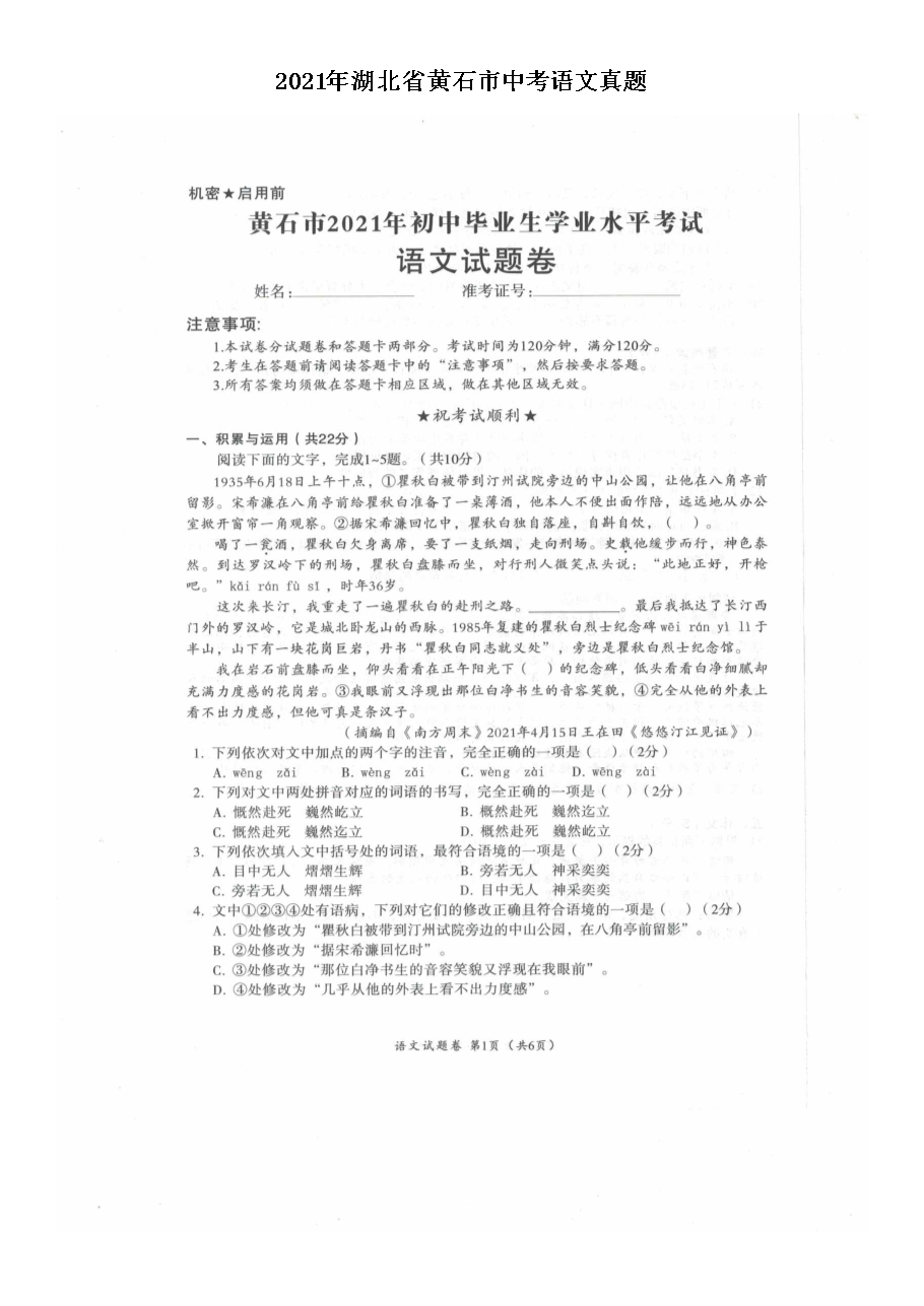 【文档名称】 2021年湖北省黄石市中考语文真题(图片版).doc