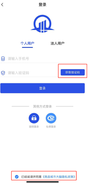 输入手机号后,点击获取验证码,填写手机收到的验证码后,勾选“已经阅读并同意《南昌城市大脑隐私政策》”,进行登录