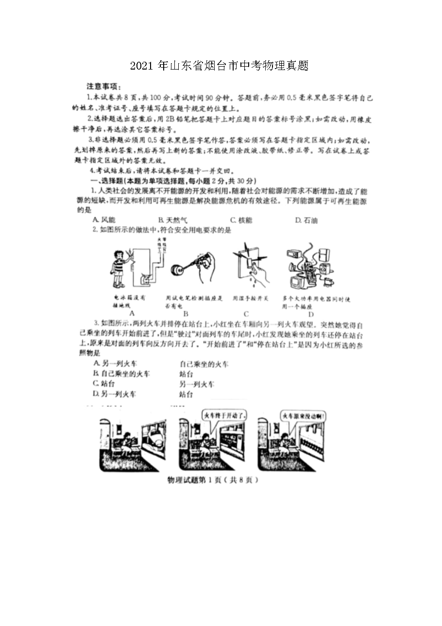 【文档名称】 2021年山东省烟台市中考物理真题(图片版).doc