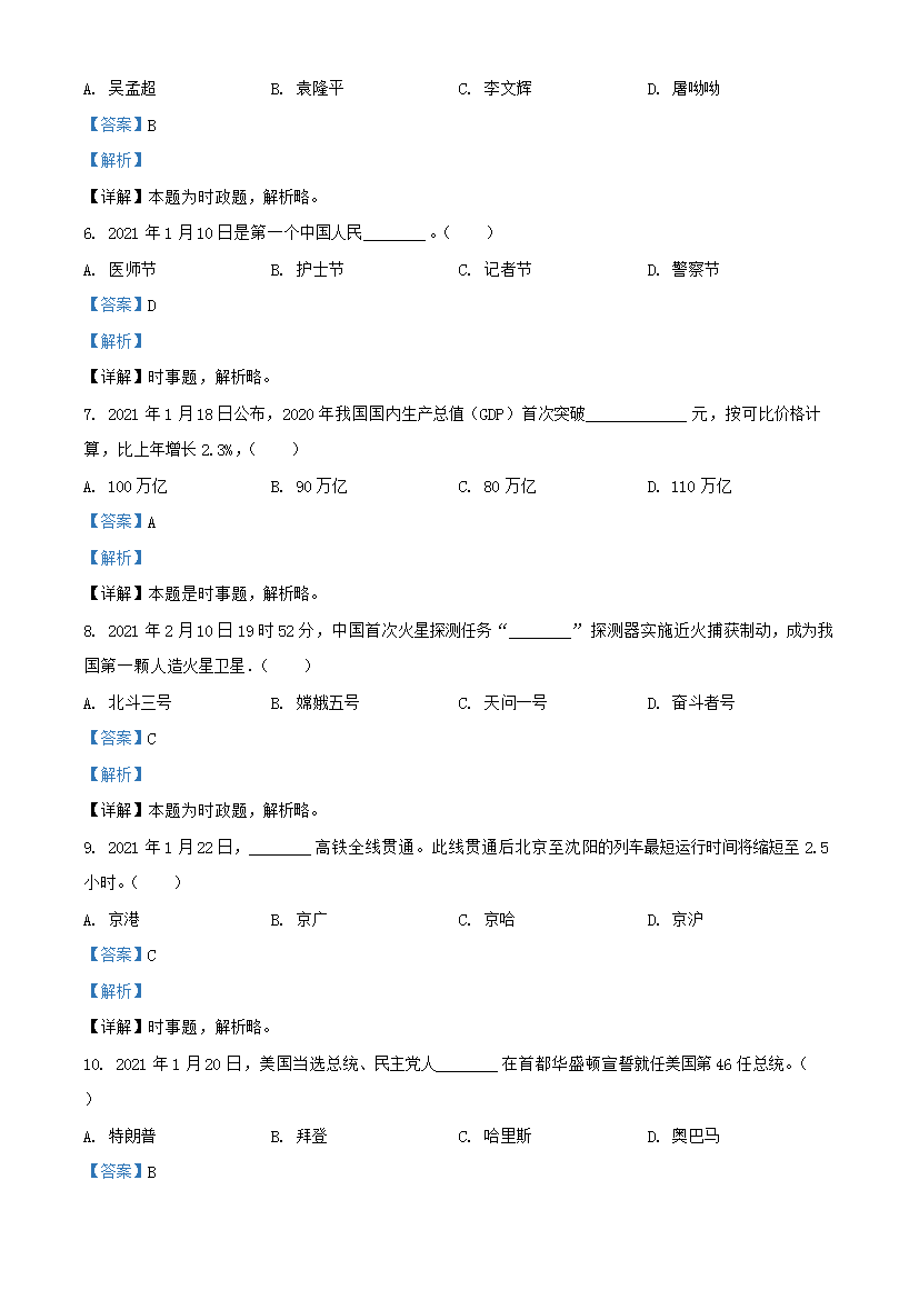 【文档名称】 2021年黑龙江鹤岗中考政治真题及答案(Word版).doc