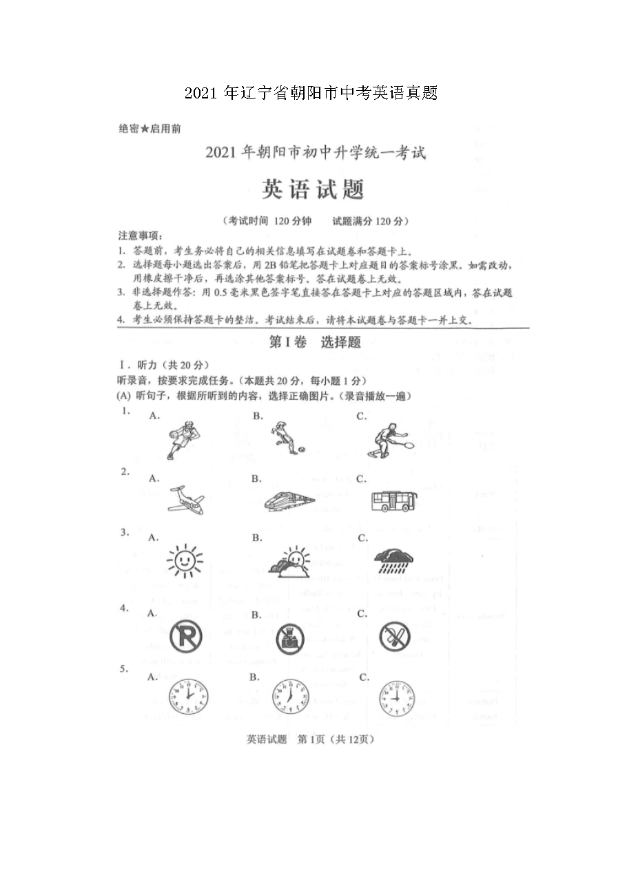 【文档名称】 2021年辽宁省朝阳市中考英语真题(图片版).doc