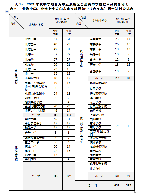 ③统招生计划。北京市第八中学北海实验学校、北海市外国语实验学校、西北师范大学北海附属中学等3所新办高中,要求中考总成绩等级须达到A等级以上(含A等级);其他学校要求中考总成绩等级须达到C+等级以上(含C+等级)。