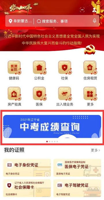 辽事通app首页滚动图片,点击2021年辽宁省中考成绩查询入口。