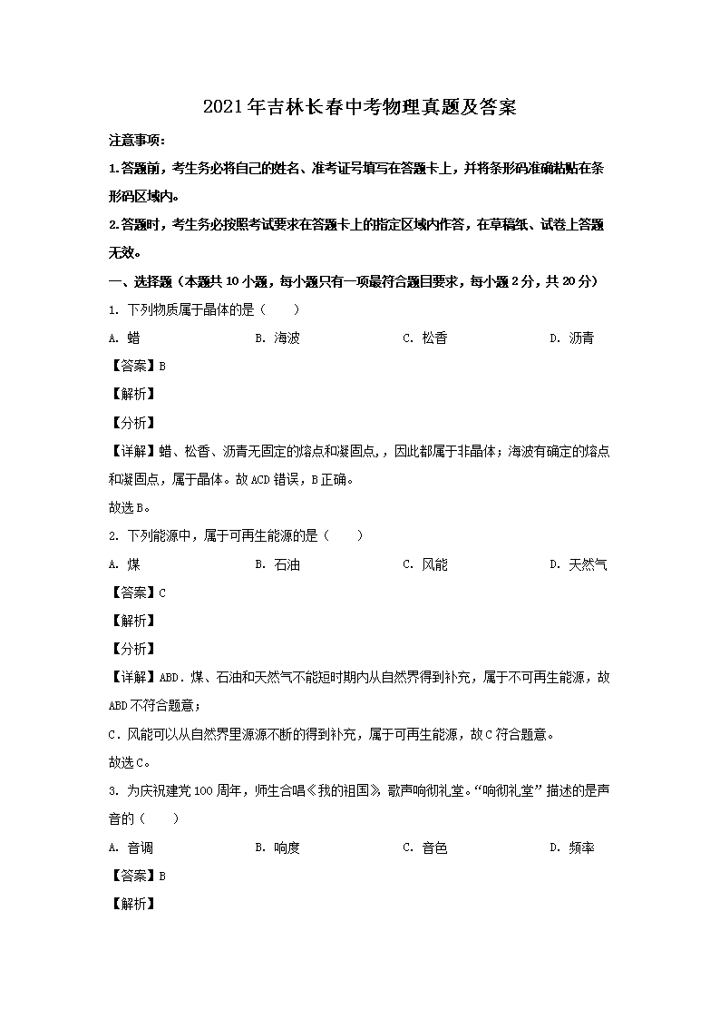 【文档名称】 2021年吉林长春中考物理真题及答案(Word版).doc