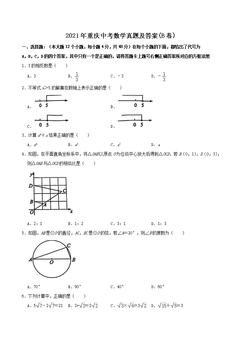 【文档名称】 2021年重庆中考数学真题及答案(B卷)(Word版).doc