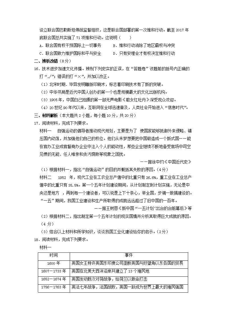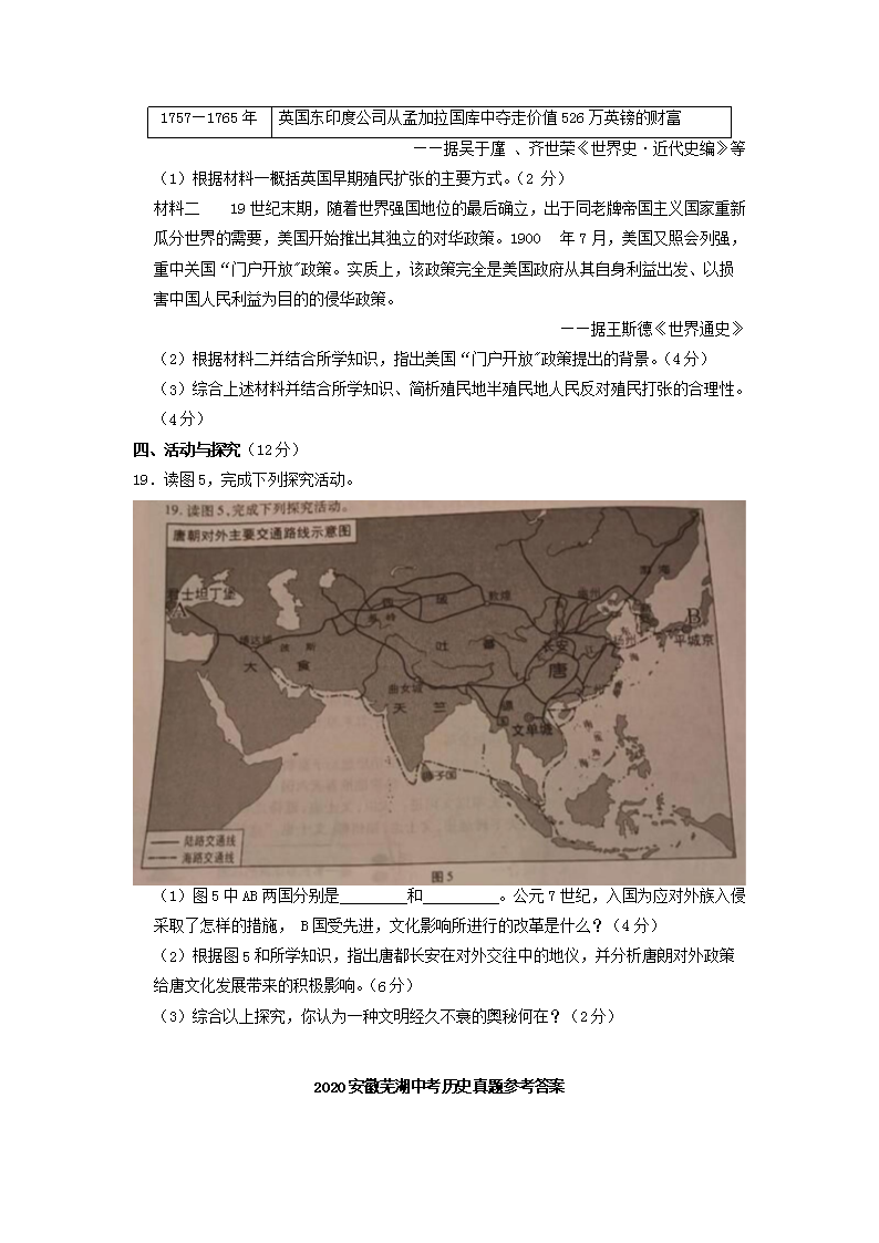 【文档名称】 2020安徽芜湖中考历史真题及答案(Word版).doc